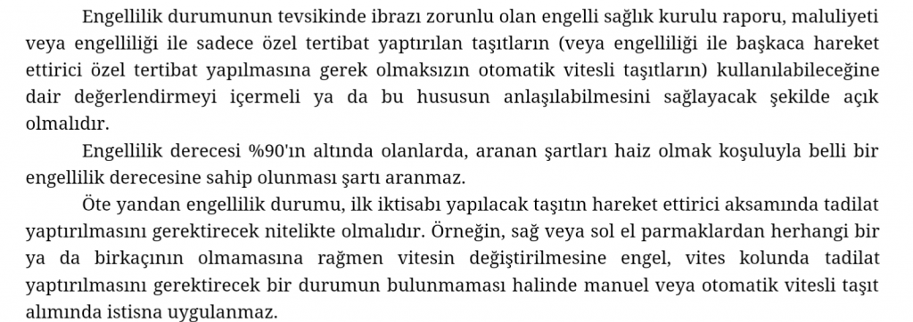Engelli bireyleri toplumun içine katmak, kazandırmak ve hayatlarını daha kolay bir hale getirmek için bir takım fırsat ve kolaylıklar oluşturulmuştur. Bu kolaylıklardan birisi de özürlü raporu ile ÖTV’siz araç satın alabilmesidir. Bu haktan yararlanabilmesi için en az %90 ve üzerinde engelinin olması gerekmektedir. Engellilik oranı %90’ın altında olanların ise özel tertibat yaptırmadan kullanamayacak durumda olması gerekmektedir. Resmi Gazete’de bu durum şu şekilde açıklanmıştır: